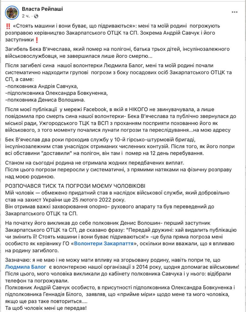 Власта Рейпаши утверждает, что областной ТЦК угрожает ей и её семье из-за публикации о смерти мобилизованного Вячеслава Бека — инсулинозависимого отца троих детей.