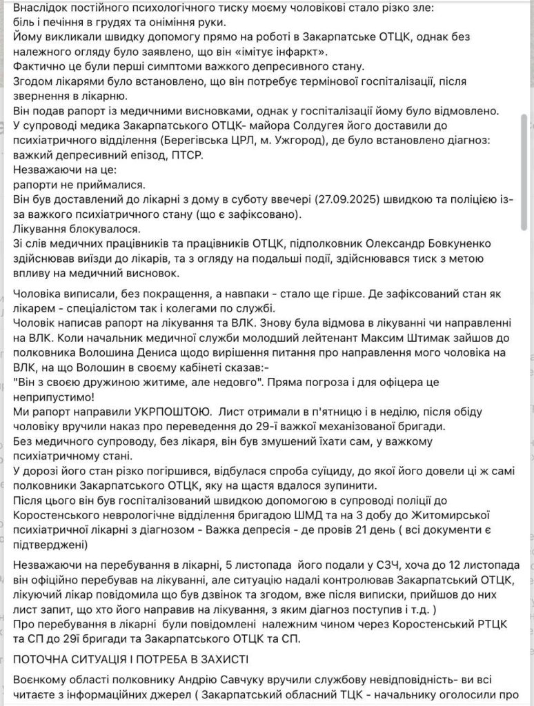 После угроз мужчине стало плохо, его доставили в больницу, затем перевели в 29-ю тяжелую механизированную бригаду. После попытки самоубийства и трёх недель в больнице его обвинили в СЗЧ.