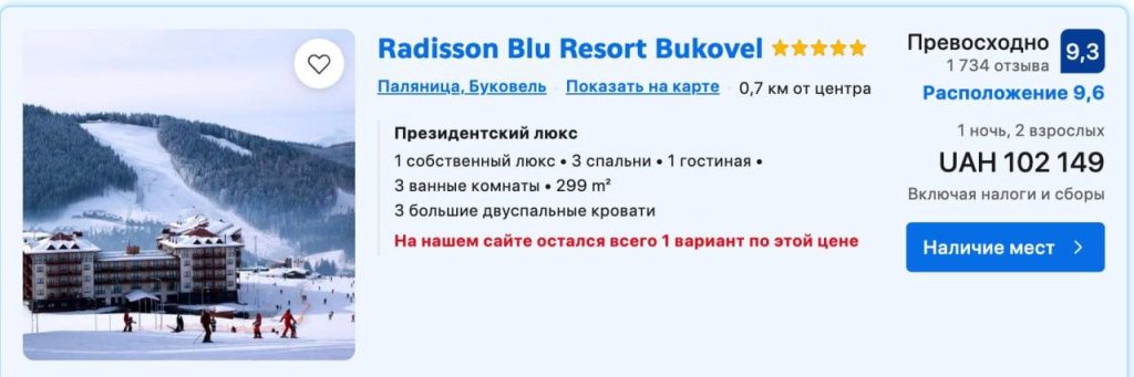 Более 200 тысяч гривен (4,7 тыс долл) за одну новогоднюю ночь. 106 тысяч (2,5 тыс долл) — номер в пятизвёздочном отеле на крупнейшем горнолыжном курорте Украины — в Буковеле, ещё около 100 тысяч (2,3 тыс долл) — за праздничную программу.