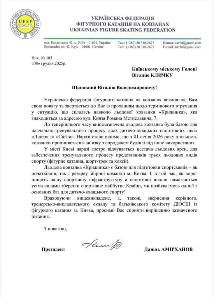 К ситуации подключилась Федерация фигурного катания на коньках Украины. Президент УФФК Данил Амирханов обратился к мэру Киева Виталию Кличко с просьбой вмешаться. Петиция на имя городского главы была подписана за два дня и в настоящее время находится на рассмотрении.