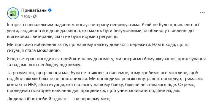 Украинский «ПриватБанк» заявил о готовности оплатить лечение и протезирование инвалиду ВСУ, который оказался в центре резонансной истории при попытке получить банковские услуги.