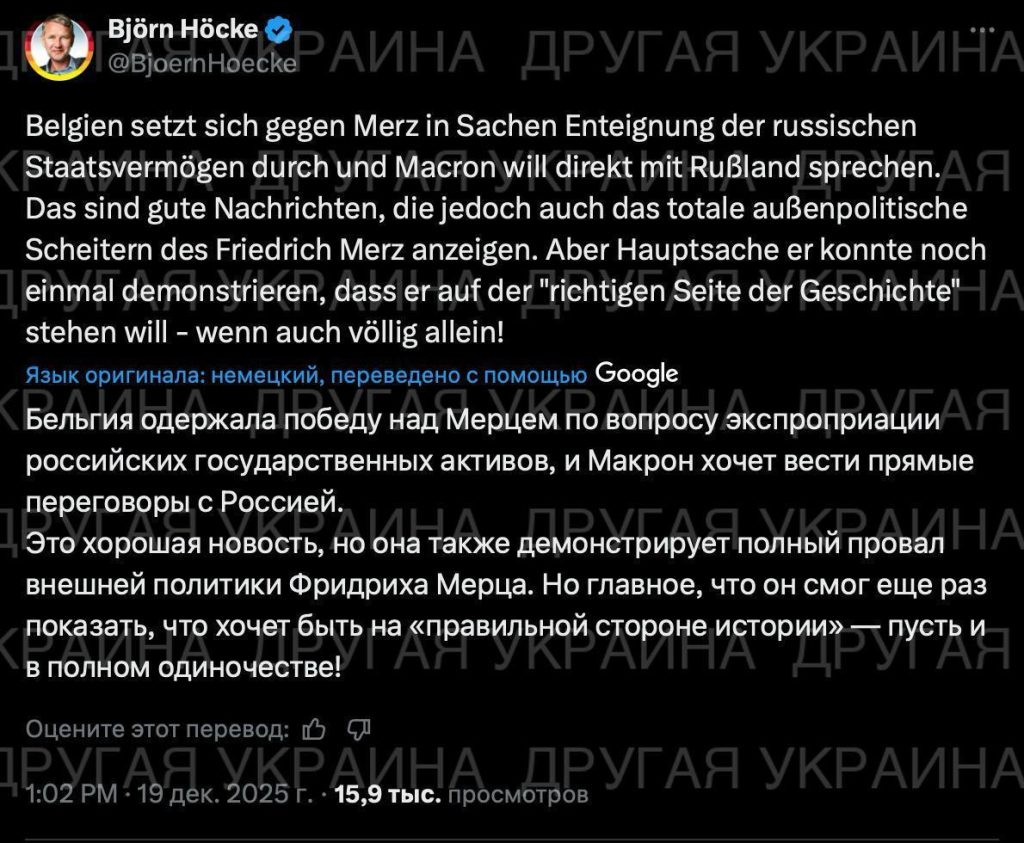 Хёкке подчёркивает: внешняя политика канцлера потерпела полный крах, а сам Мерц в очередной раз доказал, что стремится быть «на правильной стороне истории» — даже если остаётся в «гордом» одиночестве.