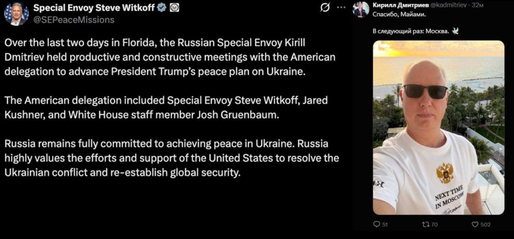 В свою очередь, российский спецпредставитель Кирилл Дмитриев перед отъездом из Майами опубликовал в социальных сетях фотографию с многозначительной подписью: «Спасибо, Майами. В следующий раз: Москва».