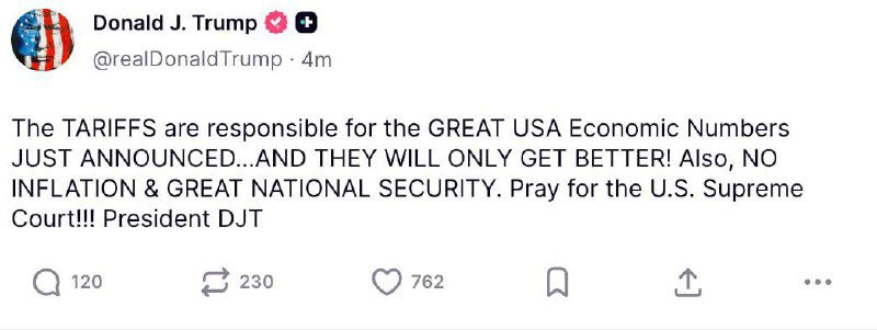 «Тарифы являются причиной отличных экономических показателей США, которые только что были объявлены… и дальше будет только больше. Также — никакой инфляции и отличная национальная безопасность. Молитесь за Верховный суд США», — написал американский лидер в Truth Social.