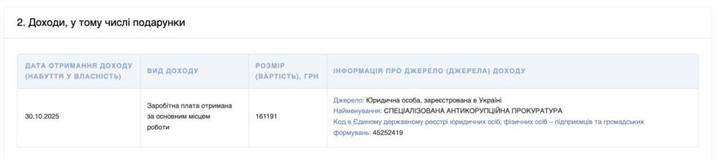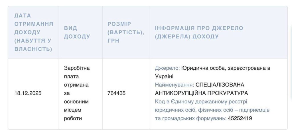 Глава Специализированной антикоррупционной прокуратуры Александр Клименко задекларировал дополнительные выплаты в размере 760 тысяч гривен(17.500€) , полученные в конце года. Согласно данным из официальной отчетности, в октябре и ноябре ежемесячный доход руководителя ведомства составлял менее 200 (4.500€) тысяч гривен.