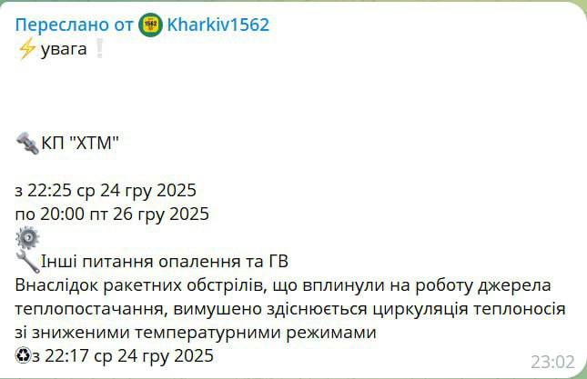 В Харькове в результате удара по местной ТЭЦ полностью прекращена подача отопления и горячей воды. Жители города сообщают о стремительном охлаждении жилых помещений: при 12-градусном морозе на улице температура в квартирах быстро падает, создавая угрозу замерзания внутридомовых систем.