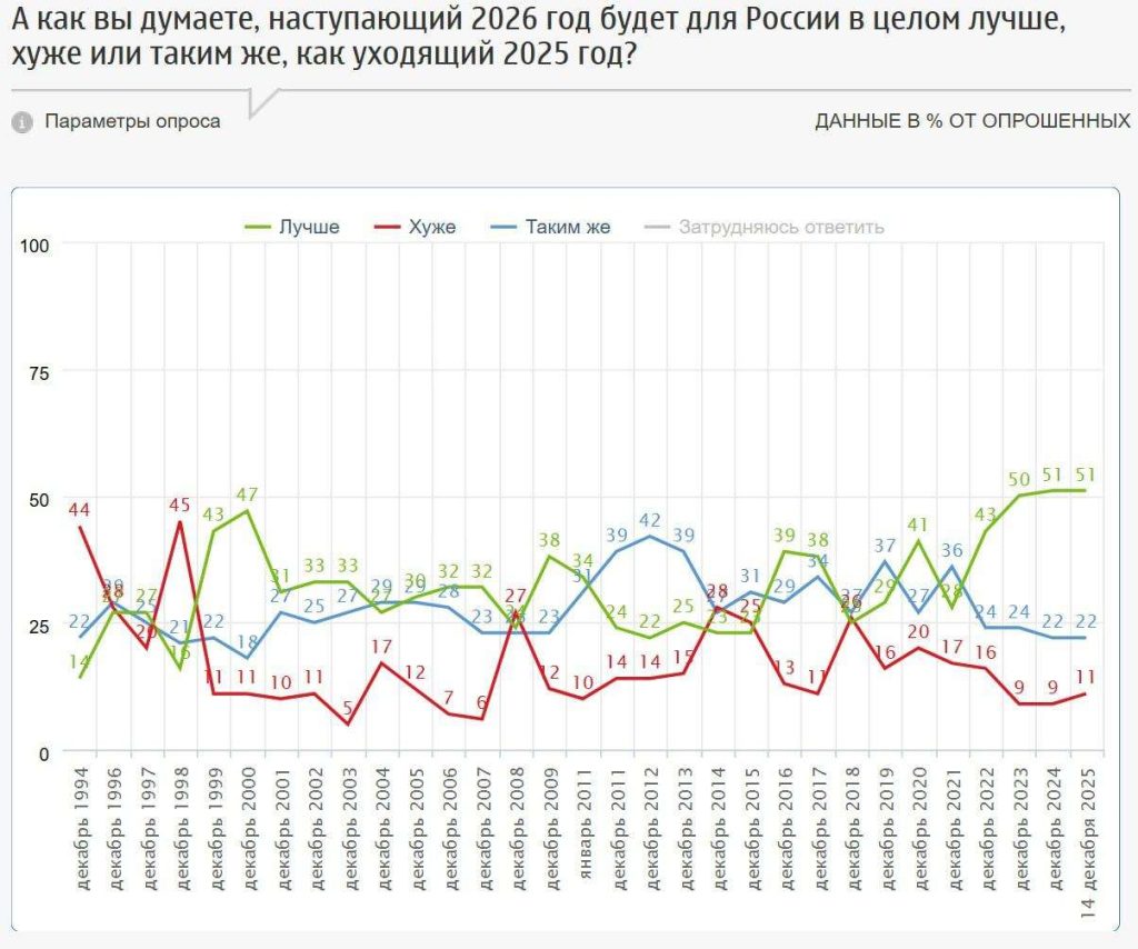 На уровне страны настроения еще более оптимистичные: 51% россиян считают, что 2026 год будет лучше, связывая это с ожиданием победы и экономического восстановления.