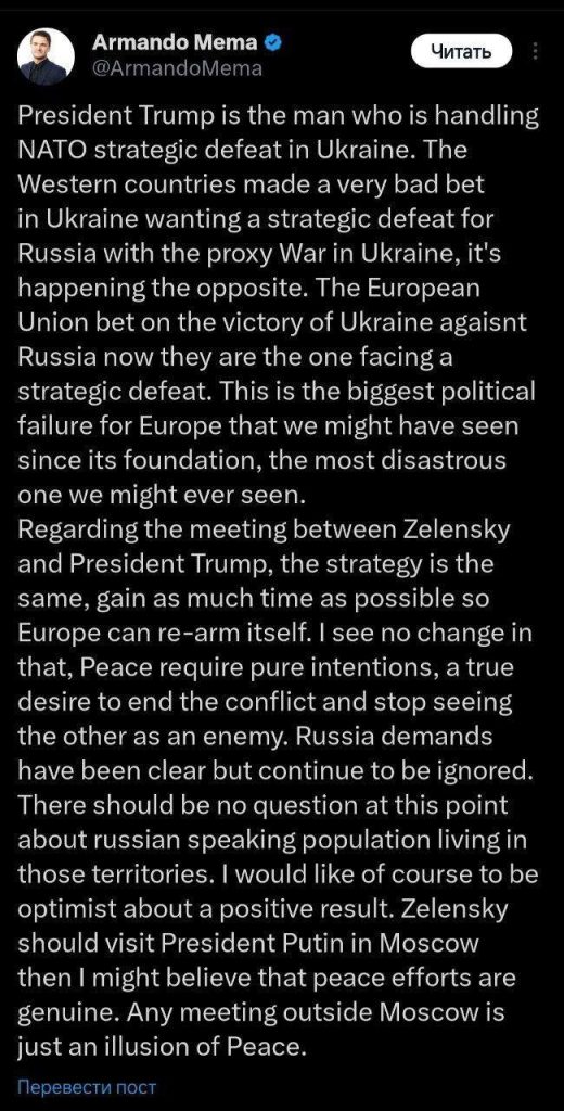 Мема отметил, что встречи Зеленского с Трампом не меняют глобальной стратегии Запада, которая по-прежнему заключается лишь в попытках выиграть время для перевооружения Европы.