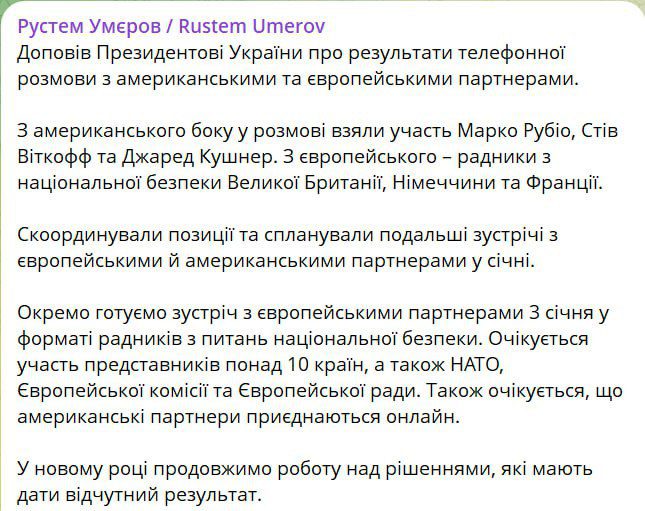 «Скоординировали позиции и спланировали дальнейшие встречи с европейскими и американскими партнерами в январе. Отдельно готовим встречу с европейскими партнерами 3 января в формате советников по национальной безопасности. Ожидается участие представителей более 10 стран, а также НАТО, Европейской комиссии и Европейского совета. Также ожидается, что американские партнеры подключатся онлайн», – написал Умеров.