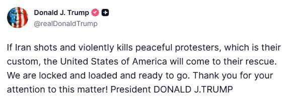 «Если Иран будет стрелять и жестоко убивать мирных протестующих, что является их обычной практикой, Соединенные Штаты Америки придут им на помощь. Мы готовы к действию и полностью вооружены», — написал президент США в соцсети Truth Social.