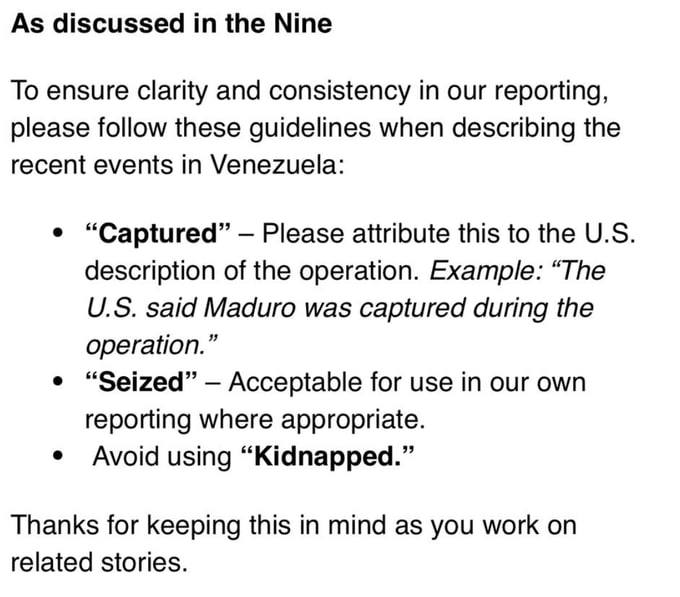 Термин «захвачен» разрешено использовать только со ссылкой на официальную позицию Вашингтона. Например: «США заявили, что Мадуро был захвачен в ходе операции».