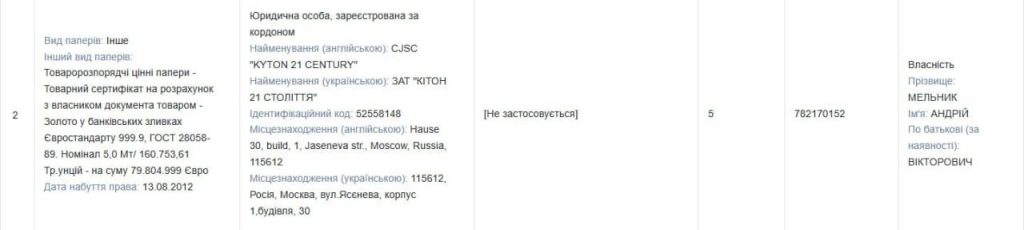 Чиновник Фонда госимущества Андрей Мельник задекларировал 5 тонн золотых слитков на € 79 млн 805 тыс которые у него хранятся в Москве.