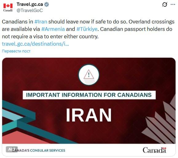 Канадцам настоятельно советуют не затягивать с выездом и использовать сухопутные маршруты через Армению или Турцию, поскольку ситуация может осложниться в любой момент.