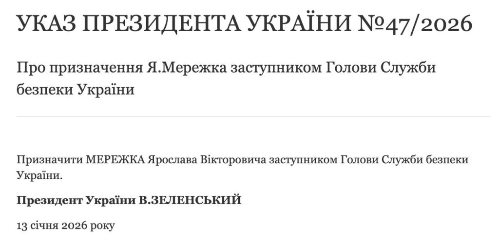 «Назначить Мережко Ярослава Викторовича, заместителем главы Службы безопасности Украины» — говорится в Указе.