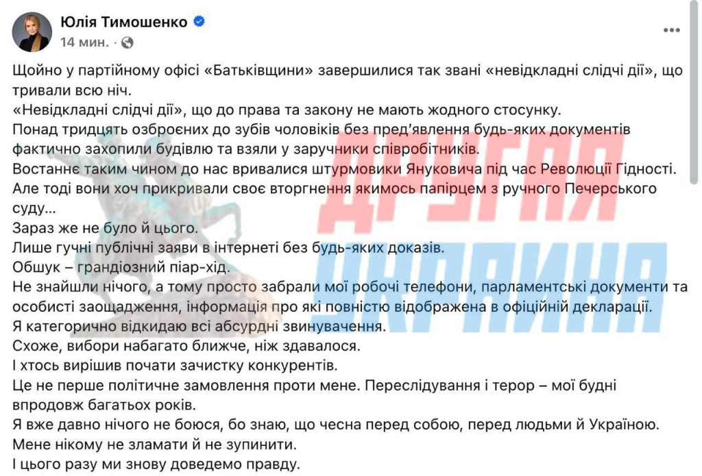 Лидер партии «Батькивщина» Юлия Тимошенко прокомментировала вручённое ей подозрение НАБУ, заявив, что в офисе партии до утра проводились обыски без судебного разрешения.