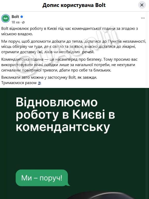 Аналогичное разрешение дали компании Bolt. В пресс-службе сервиса сообщили, что такси Bolt начнет работать в период комендантского часа уже с 00:00.