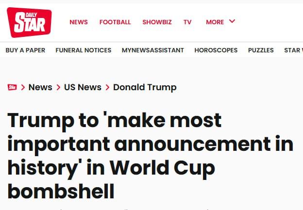 Британский режиссёр и документалист Марк Кристофер Ли заявил, что Дональд Трамп может использовать чемпионат мира по футболу 2026 года как площадку для беспрецедентного объявления — о первом контакте человечества с внеземной цивилизацией. Об этом пишет таблоид Daily Star.