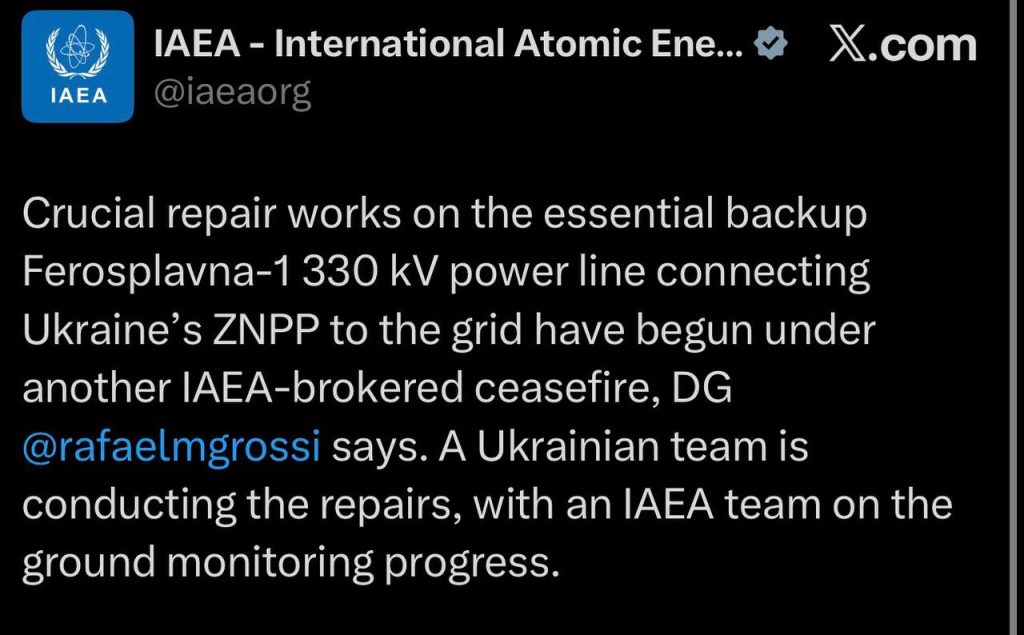 «Начались критически важные ремонтные работы на ключевой резервной линии электропередачи «Ферросплавная-1» напряжением 330 кВ, соединяющей Запорожскую АЭС с энергосистемой Украины, в рамках очередного режима прекращения огня, достигнутого при посредничестве МАГАТЭ», — указано в сообщении организации в соцсети Х*.