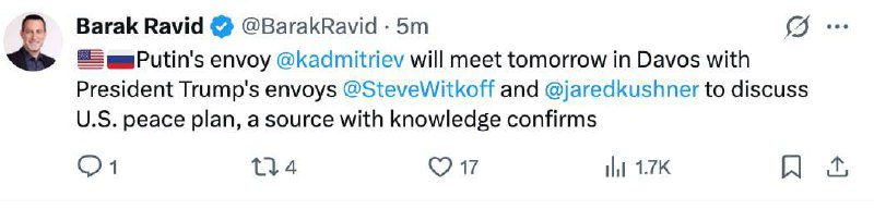 «Полномочный представитель Владимира Путина Кирилл Дмитриев завтра в Давосе встретится с представителями президента США Дональда Трампа — Стивом Уиткоффом и Джаредом Кушнером — для обсуждения американского мирного плана, подтвердил источник, знакомый с ситуацией», — написал он в соцсети X*.
