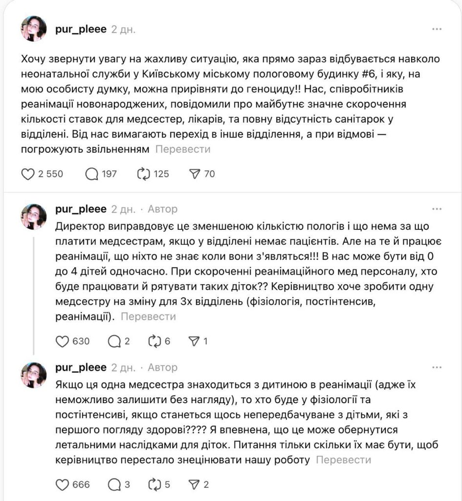 Сотрудница Киевского роддома №6 Арина Арутюнян рассказала о масштабном сокращении медсестер, что может привести к гибели детей.