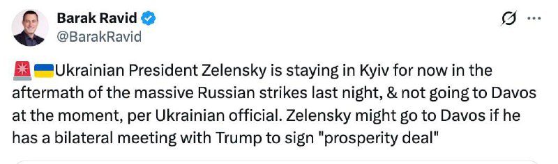 «Зеленский пока остаётся в Киеве и на данный момент не поедет в Давос, сообщил украинский чиновник. Зеленский может отправиться в Давос, если у него состоится двусторонняя встреча с Дональдом Трампом для подписания „соглашения о процветании“», — написал он.
