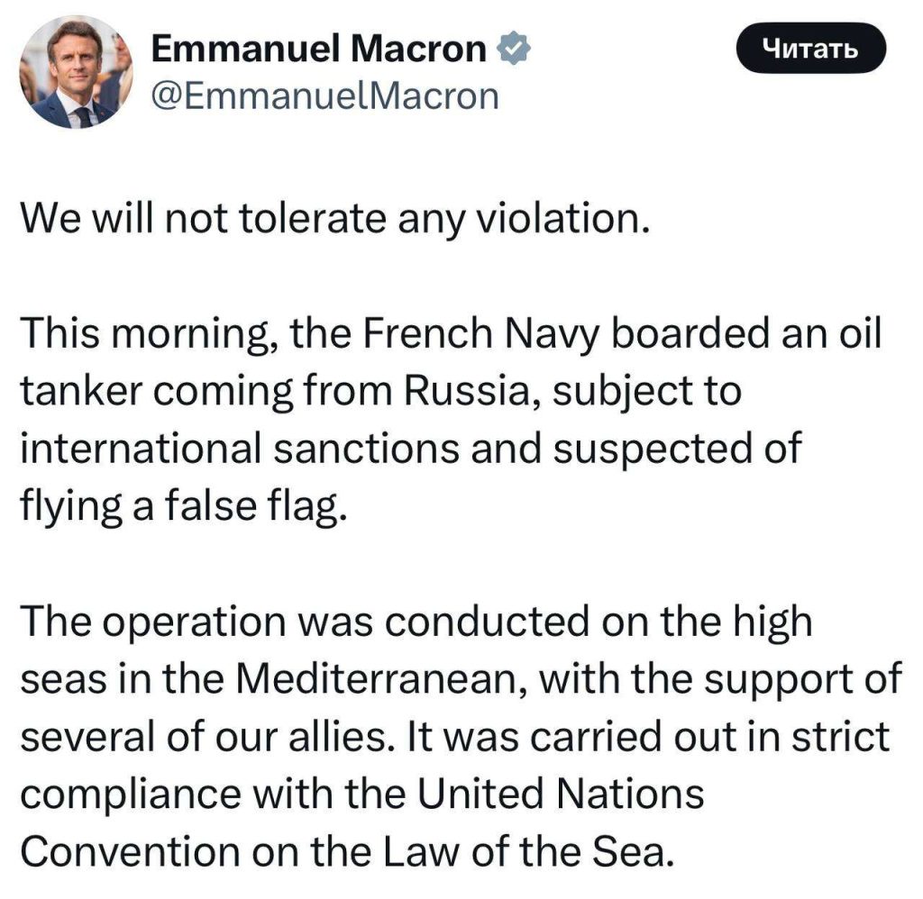 «Мы не потерпим никаких нарушений. Сегодня утром французский военно-морской флот поднялся на борт нефтяного танкера, следовавшего из России, находящегося под международными санкциями и подозреваемого в использовании провокационного флага. Операция проводилась в Средиземном море при поддержке ряда наших союзников. Она осуществлялась в строгом соответствии с Конвенцией ООН по морскому праву», — уточнил Макрон.