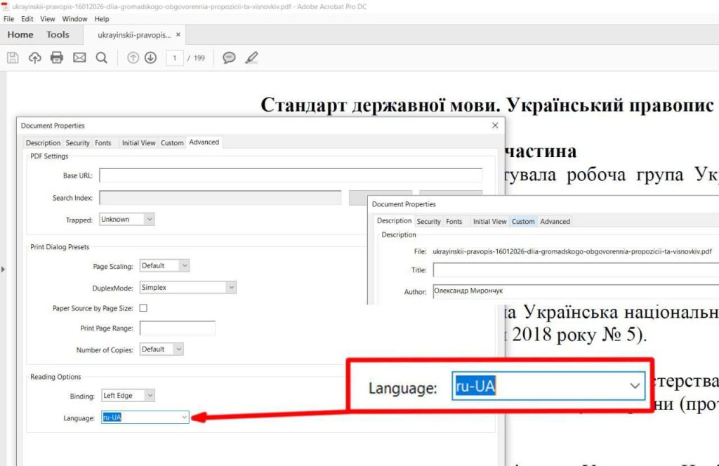 Как отмечается, рабочий документ был набран с использованием русской клавиатурной раскладки, адаптированной под украинский язык как региональный вариант русского (ru-UA). Название файла — ukrayinskii pravopis — выполнено латиницей, но по-русски.
