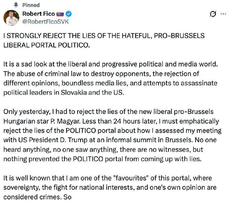 «Никто ничего не слышал, никто ничего не видел, нет свидетелей, но Politico* всё равно придумало ложь. Печальный взгляд на либеральный и прогрессивный мир СМИ и политики» — заявил Фицо.