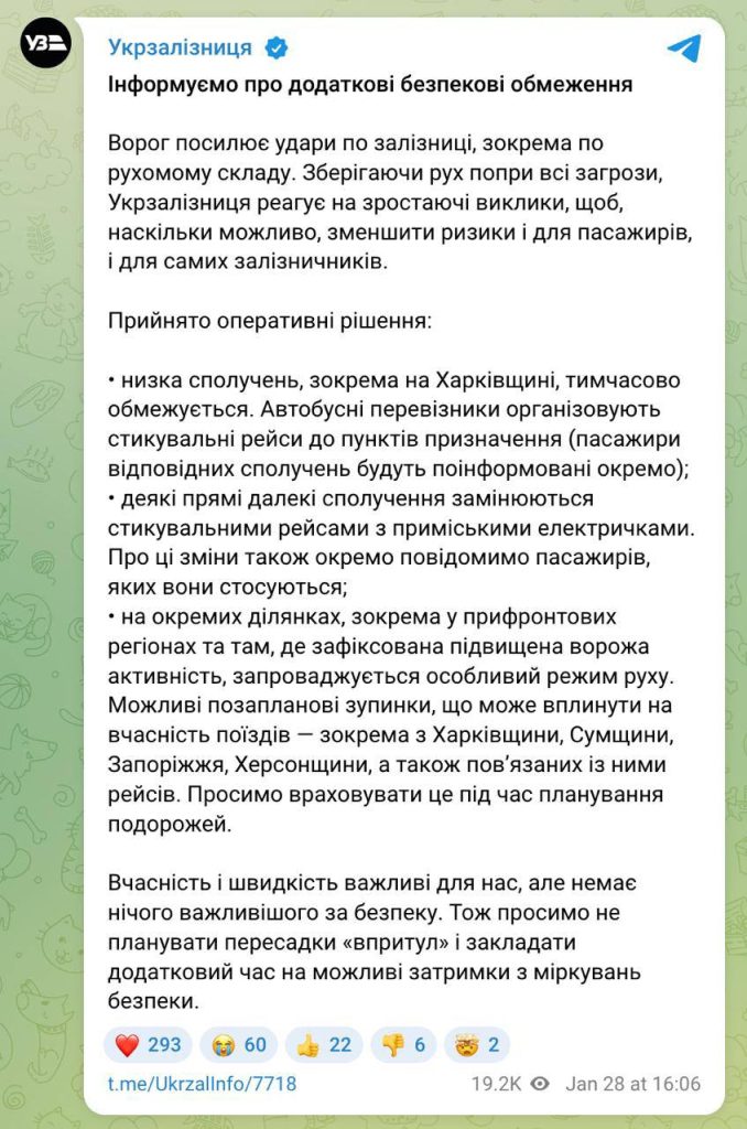 На некоторых участках введён особый режим движения, что может привести к задержкам и внеплановым остановкам — особенно на направлениях, связанных с Харьковской, Сумской, Запорожской и Херсонской областями.