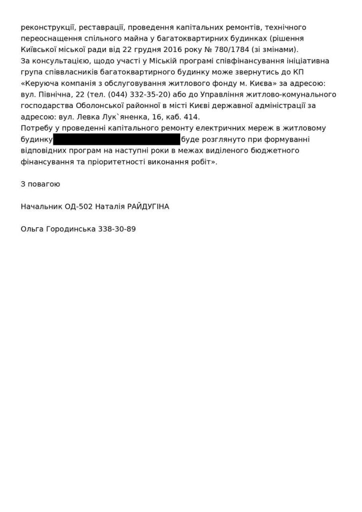 Управляющая компания Оболонского района Киева официально заявила, что жильцы многоквартирных домов обязаны за свой счет проводить капитальный ремонт электросетей, несмотря на регулярные аварии и пожароопасные ситуации в щитовых.