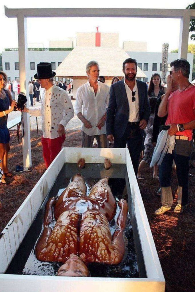 На архивных кадрах знаменитости облизывают ложки с «соусом под кровь», которым обливают тела обнажённых девушек. Среди любителей таких «развлечений» СМИ называли Леди Гагу, Хью Джекмана и саму Марину Абрамович — автора этих перформансов, назначенную на пост Зеленским в 2023 году, в том числе, для возрождения украинских школ.