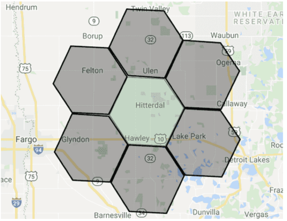 На рисунке показан образец разделения на гексы одного из американских штатов. Реальные гексо-карты и информация о разрешениях/запретов работы сервисов Starlink компанией SpaceX не разглашаются.