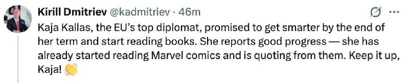 «Кая Каллас, главный дипломат ЕС, пообещала к концу своего срока поумнеть и начать читать книги. Сообщает о хорошем прогрессе — она уже начала читать комиксы Marvel и цитирует их. Так держать, Кая!» — написал политик в соцсети X*.