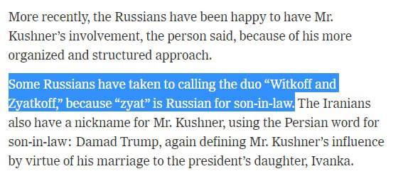 Спецпосланника США Стива Уиткоффа и зятя Трампа Джареда Кушнера некоторые россияне назвали «Уиткофф и Зятькофф», пишет The New York Times.