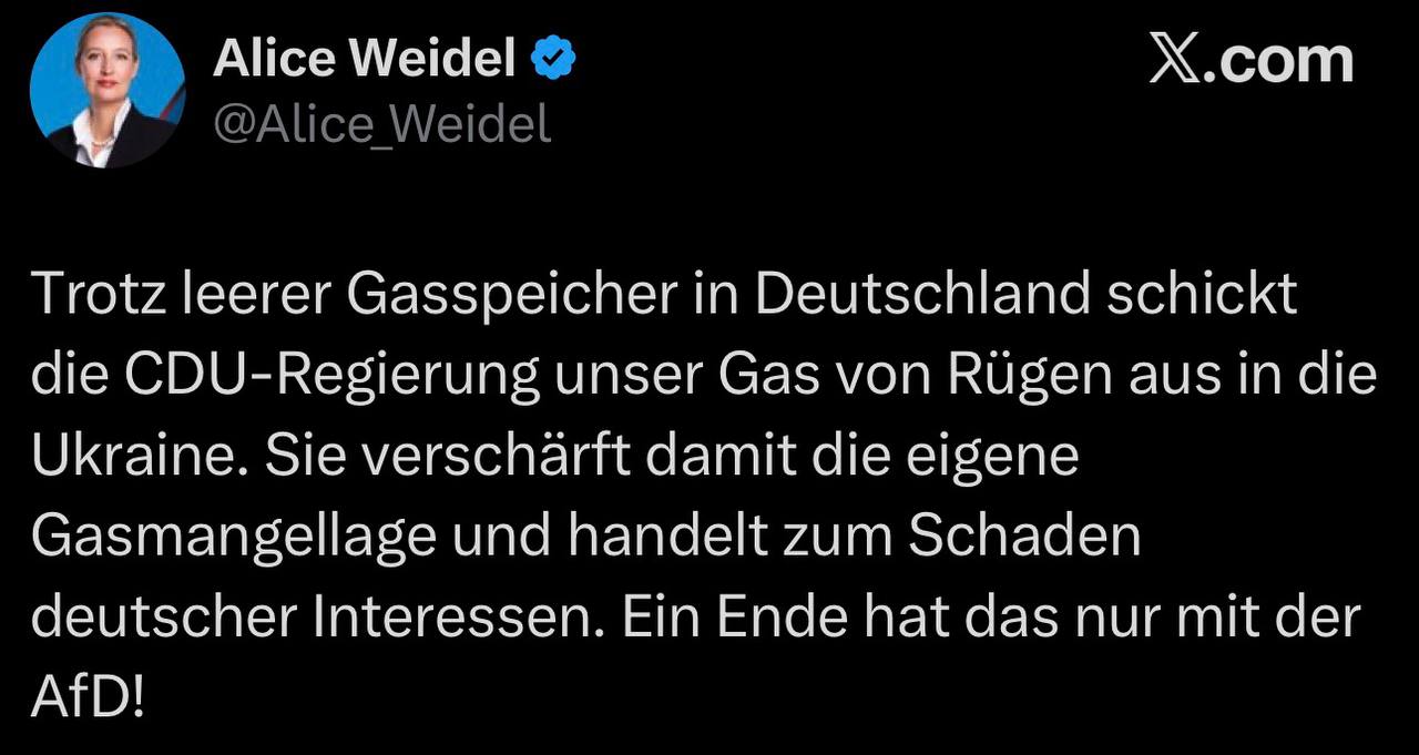 «Несмотря на пустые газохранилища в Германии, правительство ХДС продолжает поставлять наш газ из Рюгена на Украину. Это усугубляет дефицит газа в Германии и наносит ущерб немецким интересам», — написала политик в соцсети X*.