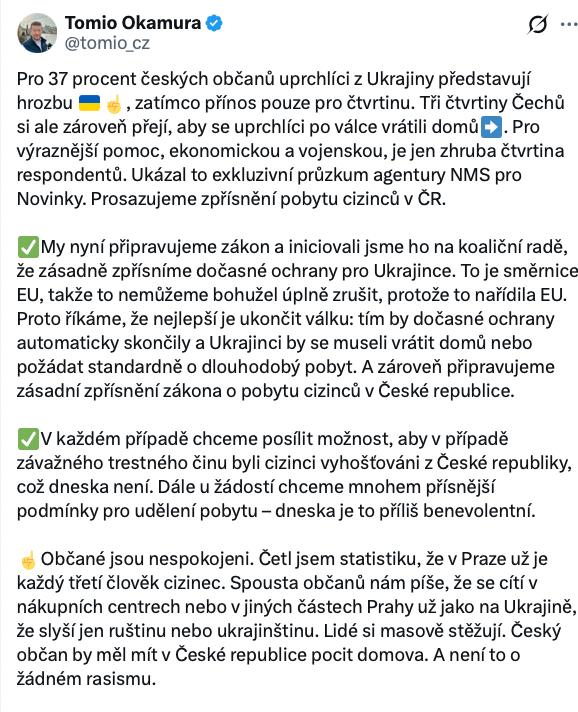 Окамура также обратил внимание на языковой дисбаланс в Праге: «Каждый третий житель Праги — иностранец. В торговых центрах люди слышат только русский или украинский язык. Это массовые жалобы». При этом политик подчеркнул, что его позиция не связана с расизмом, а продиктована интересами чешских граждан.