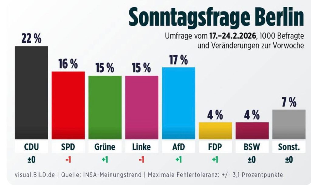 Партия «Альтернатива для Германии» (АдГ) совершила прорыв в Берлине, заняв второе место в рейтингах по популярности среди жителей немецкой столицы.
