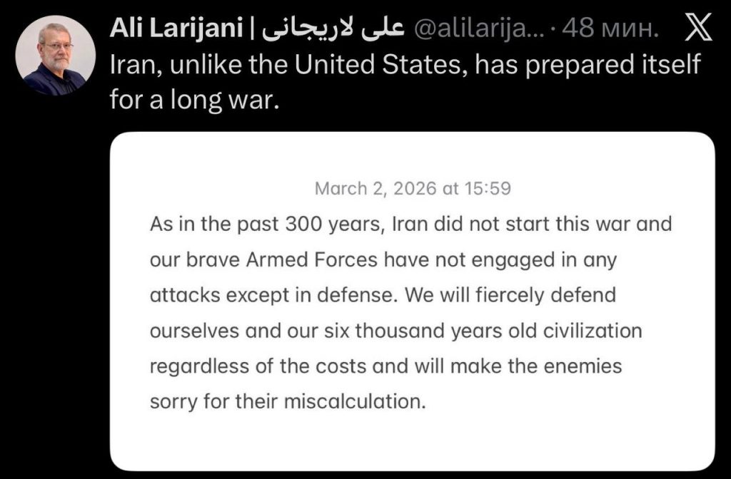Соответсвующие заявление сделал секретарь Высшего совета национальной безопасности исламской республики Али Лариджани в соцсети X*.