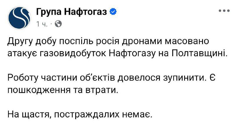 Российские беспилотники продолжают наносить удары по объектам газодобычи АО «Укргазвидобування» (входит в структуру НАК «Нафтогаз Украины») в Полтавской области. Атаки, начавшиеся накануне, возобновились минувшей ночью.