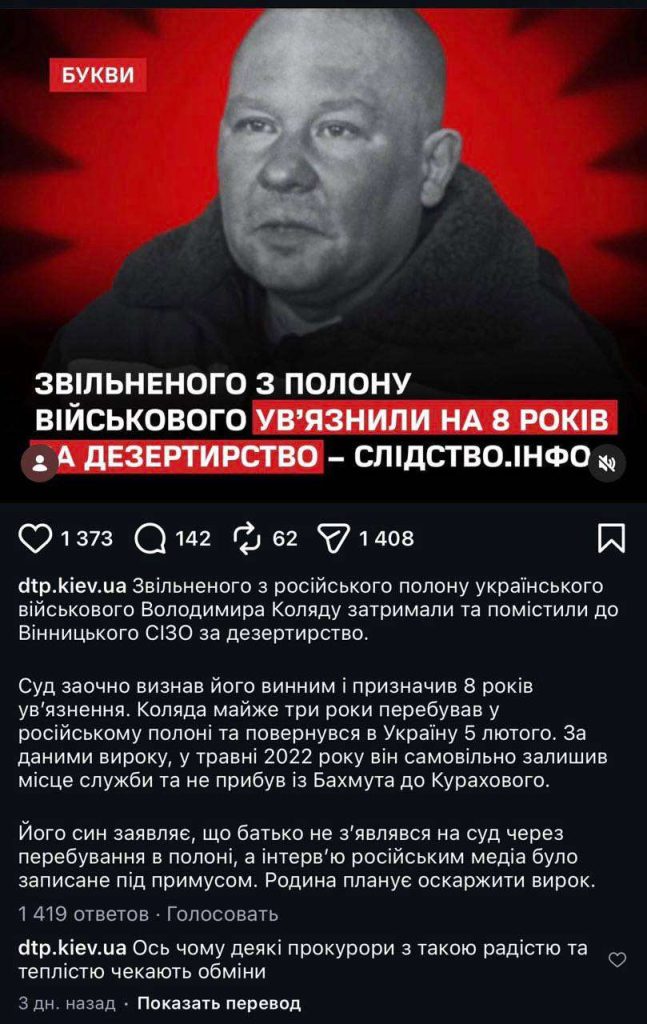 Винницкий суд заочно приговорил к восьми годам лишения свободы украинского военнослужащего Владимира Коляду, который почти три года находился в российском плену и был освобожден в начале февраля.