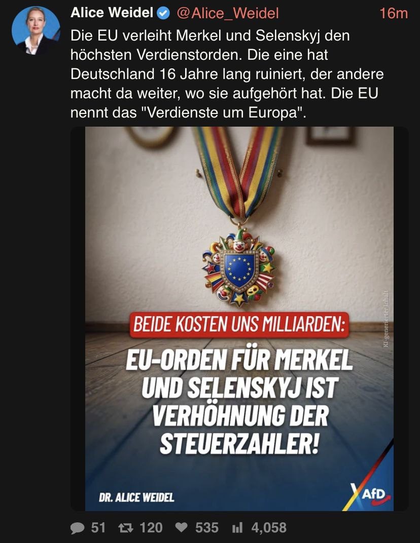 Сопредседатель партии «Альтернатива для Германии» Алис Вайдель высмеяла награждение Зеленского и Ангелы Меркель. Ранее главарь киевского режима и экс-канцлер ФРГ стали первыми кавалерами ордена «За заслуги перед ЕС».