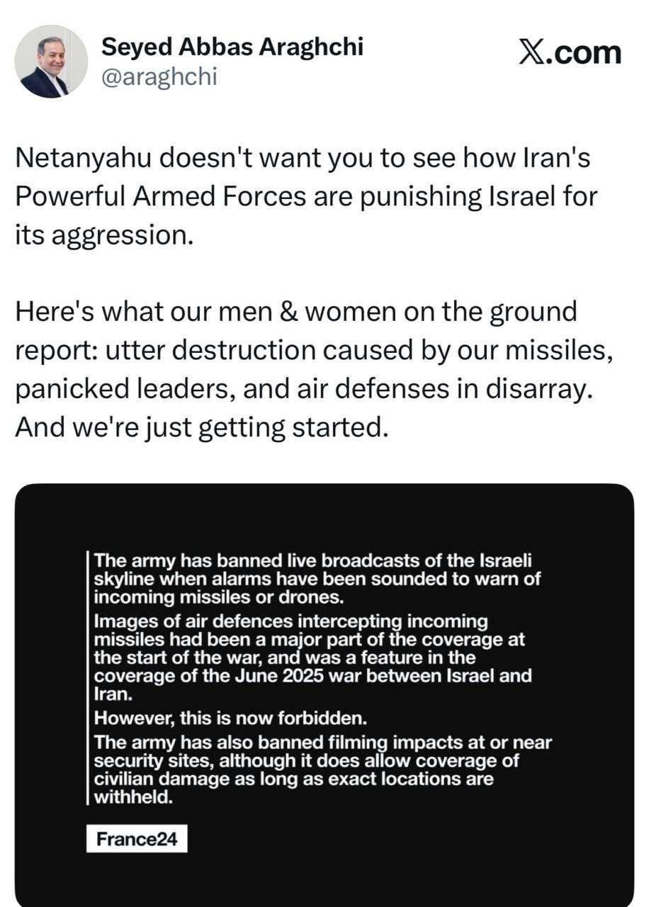 «Нетаньяху не хочет, чтобы вы увидели, как мощные вооружённые силы Ирана наказывают Израиль за его агрессию. Вот что сообщают наши мужчины и женщины на местах: полное разрушение, вызванное нашими ракетами, паника среди руководства и дезорганизованная система противовоздушной обороны. А мы только начинаем», — написал политик в соцсети X*.