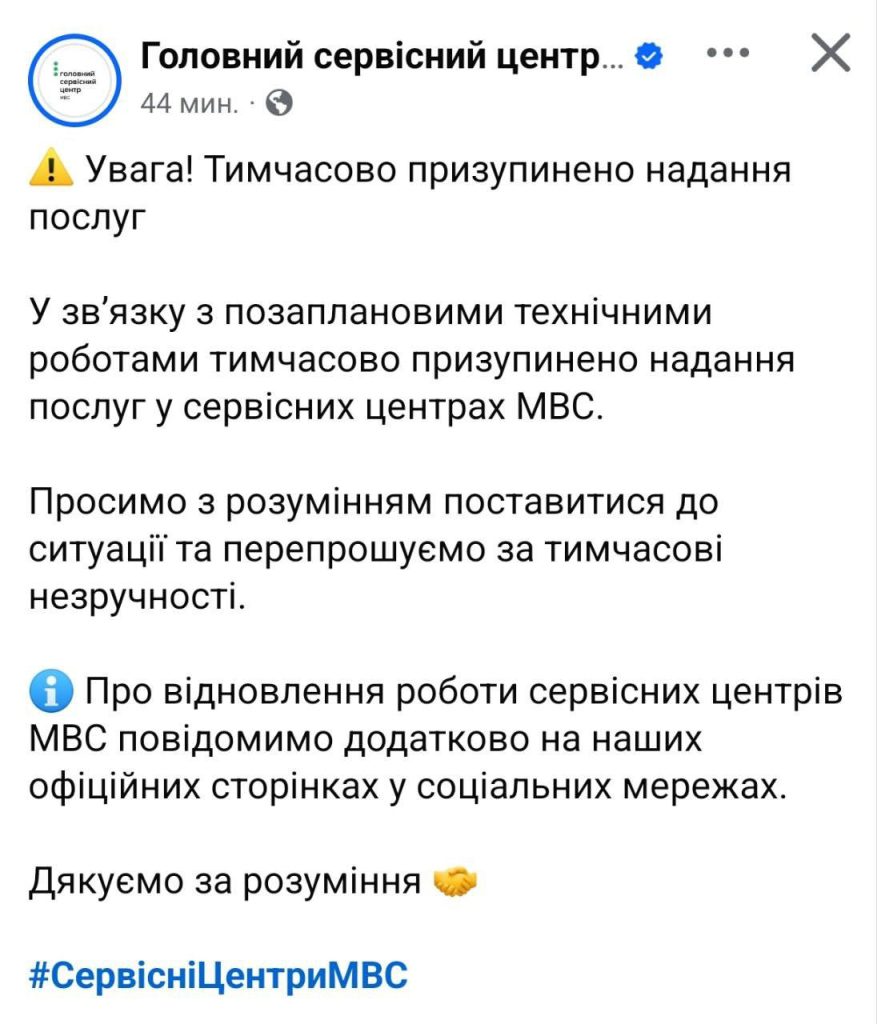 На территории Украины временно прекращено оказание услуг во всех сервисных центрах Министерства внутренних дел. Об этом сообщила пресс-служба ведомства.
