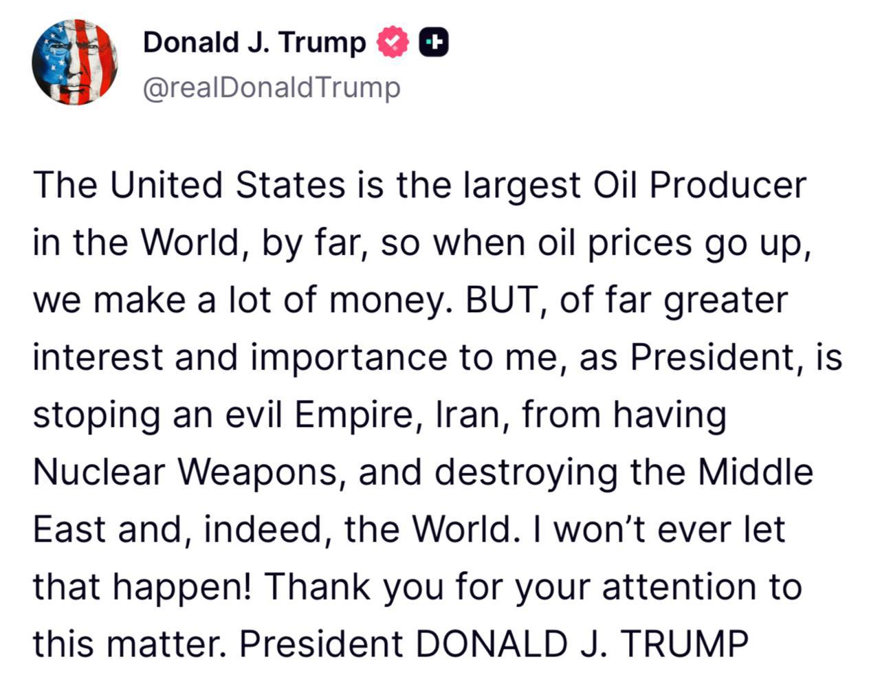 «На сегодняшний день Соединенные Штаты являются крупнейшим производителем нефти в мире, поэтому, когда цены на нефть растут, мы зарабатываем много денег. НО гораздо больший интерес и важность для меня, как президента, заключается в том, чтобы помешать Империи зла, Ирану, получить ядерное оружие и уничтожить Ближний Восток и, по сути, весь мир. Я никогда не позволю этому случиться!» — написал политик в соцсети Truth Social.