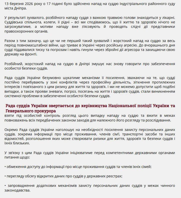 В связи с произошедшим Совет судей Украины выступил с призывом к государственным органам усилить меры по защите персональных данных судей. В ведомстве подчеркивают, что открытость личной информации в условиях существующих угроз создает прямые риски для жизни и здоровья представителей судебной ветви власти.