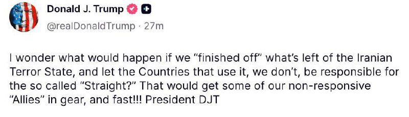 «Интересно, что будет, если мы «добьём» то, что осталось от иранского террористического государства, и позволим странам, которые им пользуются, а не мы, отвечать за так называемый «пролив»? Это быстро привело бы в чувство некоторых наших «нерешительных» союзников, и очень быстро!!!» — написал политик в соцсети Truth Social.