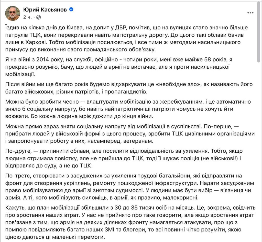 «То есть мобилизация усиливается, и всё теми же методами насильственного принуждения к выполнению своего гражданского долга. После конфликта мы еще много лет будем отхаркивать это «необходимое зло», как называют его многие военные, разные патриоты и пропагандисты», — пишет Касьянов.