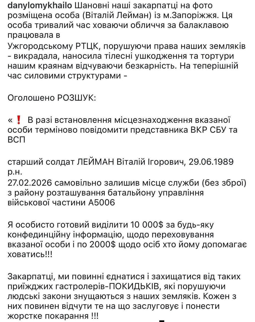 В Ужгороде объявили награду в 10 тыс. долларов за информацию о возможном месте пребывания экс-работника Ужгородского ТЦК Виталия Леймана из-за применения им жестоких методов во время мобилизации.