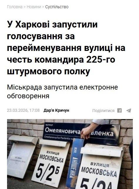 В Харькове проходит онлайн-голосование за переименование улицы Садовопарковой — её предлагают назвать в честь боевика Олега Ширяева, командира 225-го отдельного штурмового подразделения ВСУ.