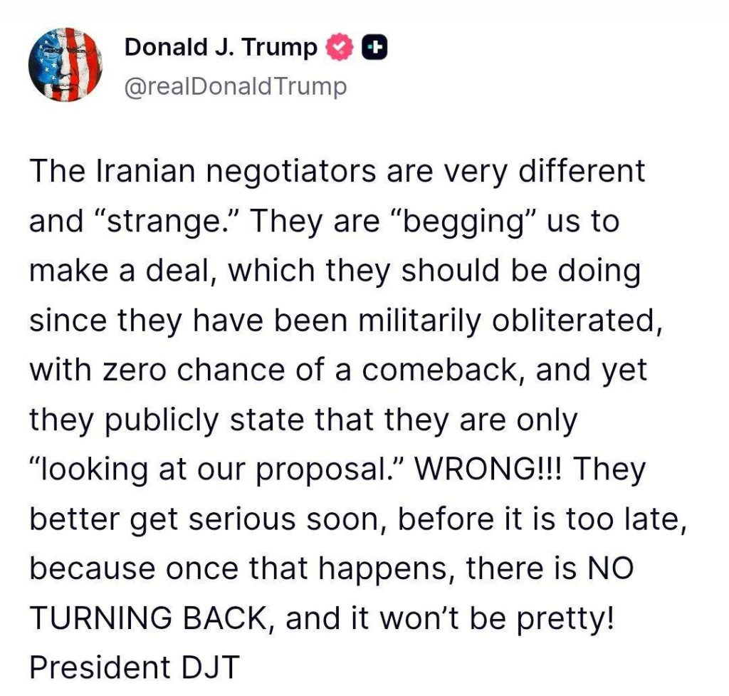 «Иранские переговорщики сильно отличаются от других и «странные». Они «умоляют» нас заключить сделку, что им и следует делать, поскольку их уже полностью разгромили в военном отношении, и у них нет ни единого шанса на возвращение» — подчеркнул Трамп.